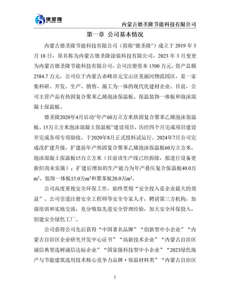 內(nèi)蒙古德圣隆節(jié)能科技有限公司成立于2019年,位于內(nèi)蒙古赤峰市元寶山區(qū)美麗河鎮(zhèn)物流園區(qū),是一家集科研、開(kāi)發(fā)、生產(chǎn)、銷(xiāo)售、施工為一體的現(xiàn)代化建材企業(yè)。公司主營(yíng)產(chǎn)品:熱固復(fù)合聚苯乙烯泡沫保溫板、保溫裝飾一體板和泡沫混凝土保溫板,年生產(chǎn)能力達(dá)到6000000平方米。
